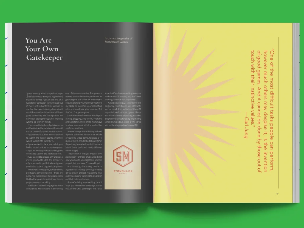 My goal for this project is curiate a periodical about tabletop games and gaming that does service to the high level of quality that games have been brought up to in the last few years. Just as board games are tangible experiences, I want to make an artifact that is engaging, fun and will bring readers back to discover new nuggets of wisdom and insight into the hobby.