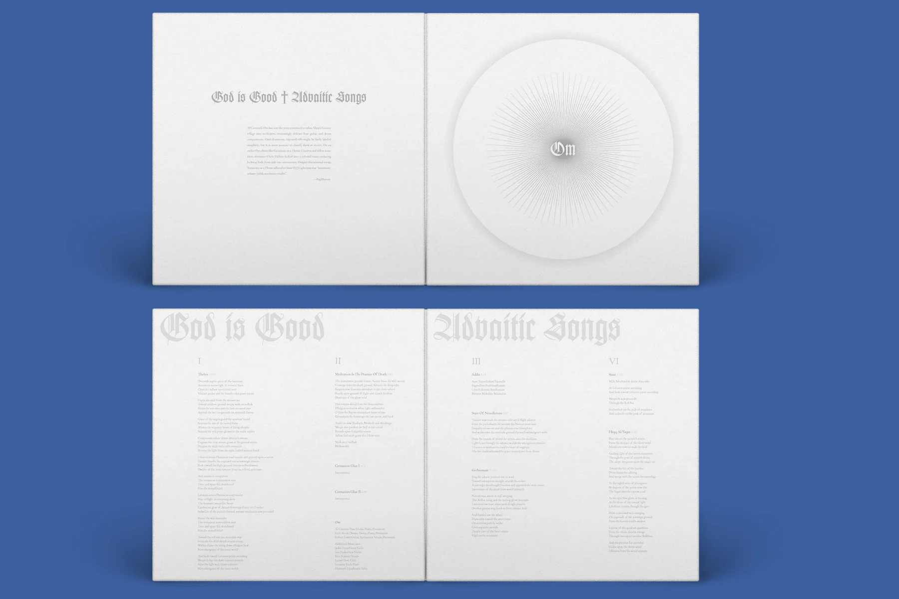 A gatefold album cover combining two of Om’s albums into one release— ‘God is Good’ and ‘Advaitic Songs.”