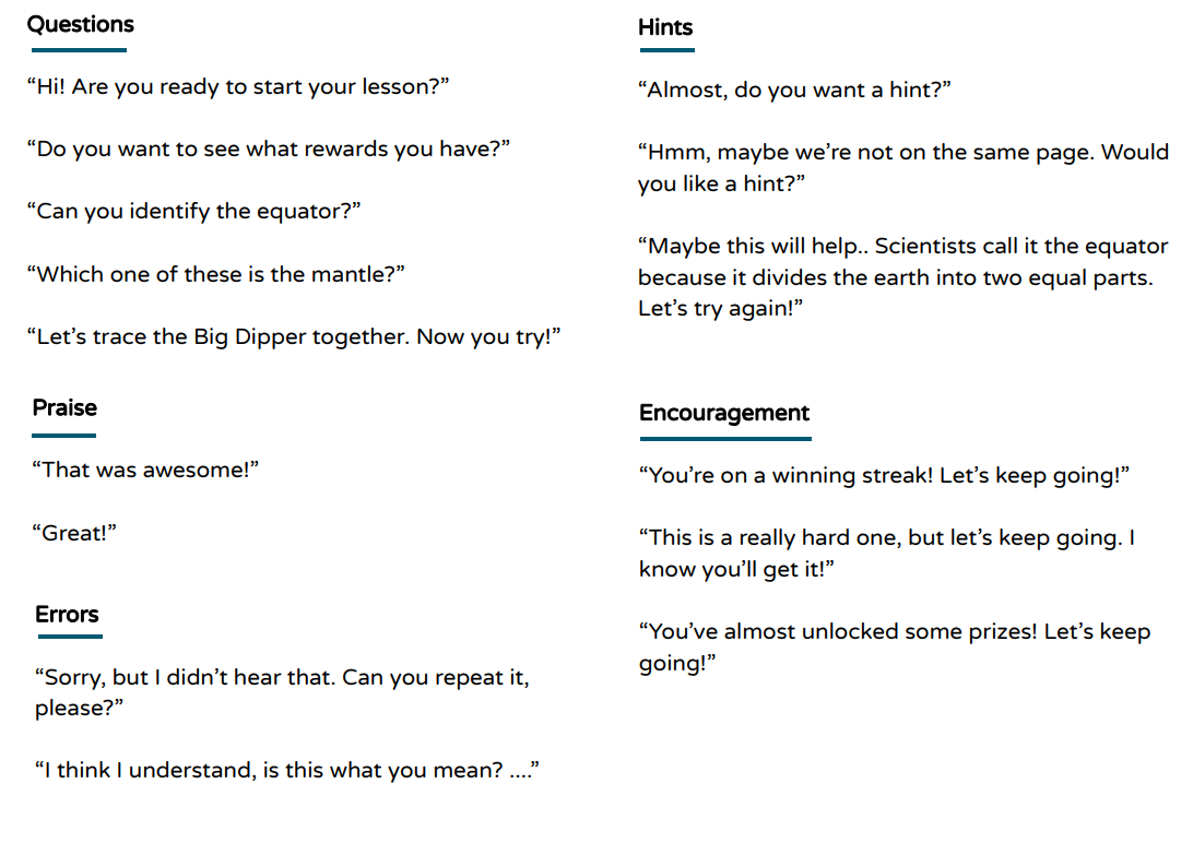 From our research on age appropriate learning we fleshed out the VUI conversation flows and tone.