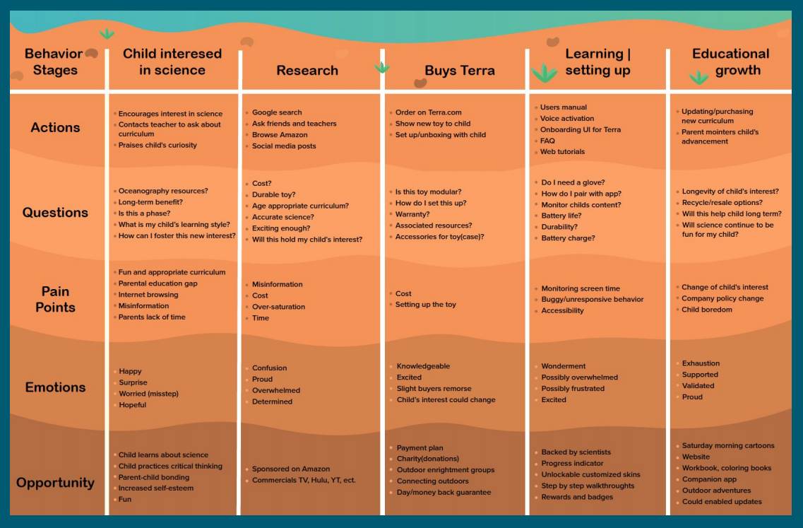 We began by ideating on the challenge and landed on the idea of an earth sciences toy. From there we dove into research on earth science education, learning styles and teaching styles as well as the current state of robot and VUI technologies. Based on what we found we decided on educating for elementary aged children with a touch screen globe. From there we made personas of both a child and their parent, a journey map from the perspective of the parent and started moodboarding.
